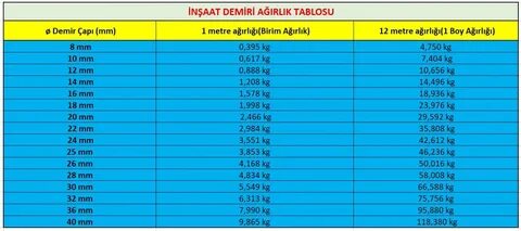 Aynı mantıkla 8–40 mm arası tüm inşaat demiri çaplarında ağırlığı hesaplayabilirsin.